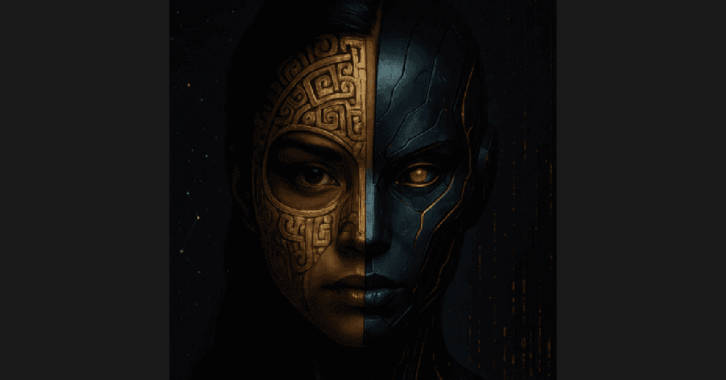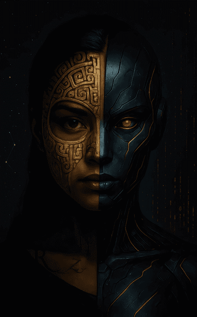 In this piece, considering the open call’s theme, I aimed to explore the duality of heritage and the future. It’s an image of a Latina woman split into two halves: one half wears the golden mask of ancient civilizations, while the other transforms into a cybernetic vision. It’s a symbolic representation of ancestral knowledge being converted into modern technology and power. It also alludes to a culture that never fades, but rather adapts and heals itself, guiding us toward the future.